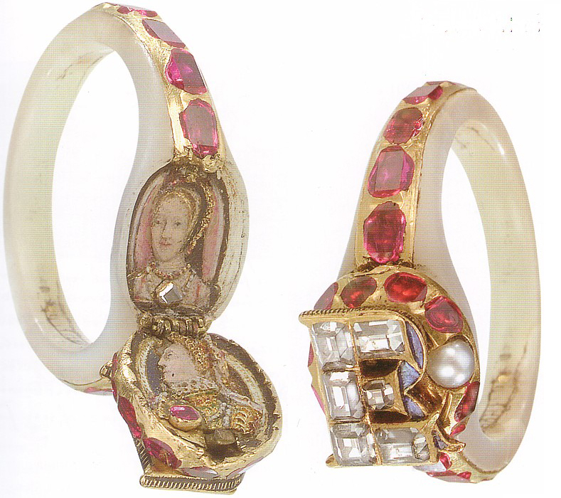 Historically, one of the most famous lockets — known as the Chequers locket — belonged to Queen Elizabeth I, who ruled England from 1558-1603. Throughout her lifetime she wore a ring (allegedly every day, until it was removed when she died) made of mother of pearl and rubies with the initial “E” formed in diamonds and an enameled initial “R”. The top of the ring opened to reveal a miniature portrait of herself on one side and her mother Anne Boleyn — who was executed by Elizabeth’s father Henry VIII — on the other side. Some historians question whether or not the portrait is actually Anne Boleyn, but rather Catherine Parr, who raised Elizabeth. Today, the locket ring is displayed at Chequers, the country residence of the UK prime minister. Queen Elizabeth I was so charmed by lockets that she was known to gift the jewel to favored courtiers and other notables, including Sir Francis Drake.